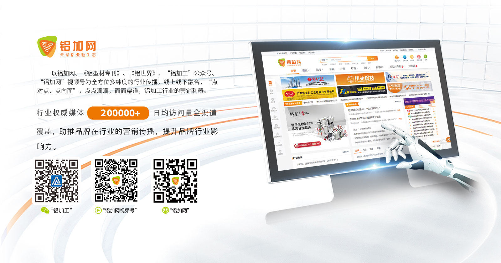 鋁加網(wǎng)(www.albiz.cn)是聞名鋁加工行業(yè)的垂直門戶網(wǎng)站,云聚鋁業(yè)新生態(tài),構(gòu)建鋁業(yè)新場景,以albiz.cn 網(wǎng)站為核心,以移動云端、鋁加工微信、鋁加網(wǎng)視頻號、《鋁型材??泛汀朵X世界》雜志為載體,成為了鋁加工行業(yè)資訊和精準(zhǔn)傳播的首選傳媒。鋁加網(wǎng),采集和發(fā)布全行業(yè)信息資訊,提供線上展覽、在線直播、短視頻、品牌策劃、品牌運(yùn)營、品牌傳播等全方位的專業(yè)服務(wù)。